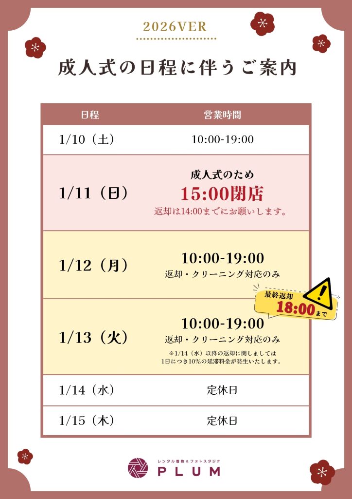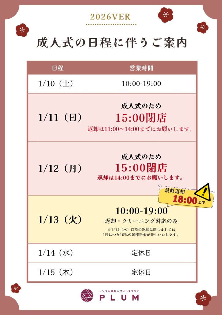 2026年成人式に伴い、下記期間の営業時間および対応内容が