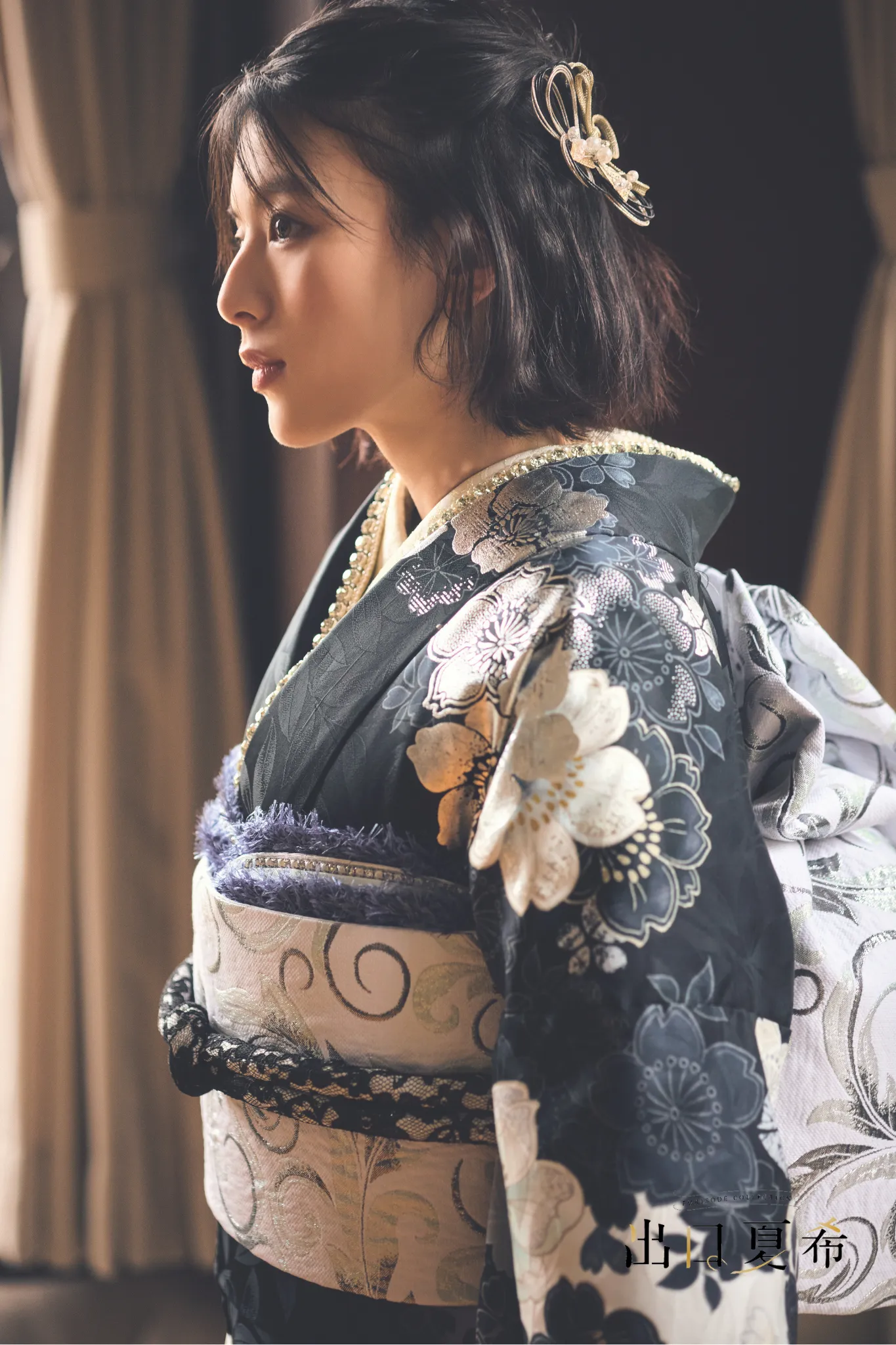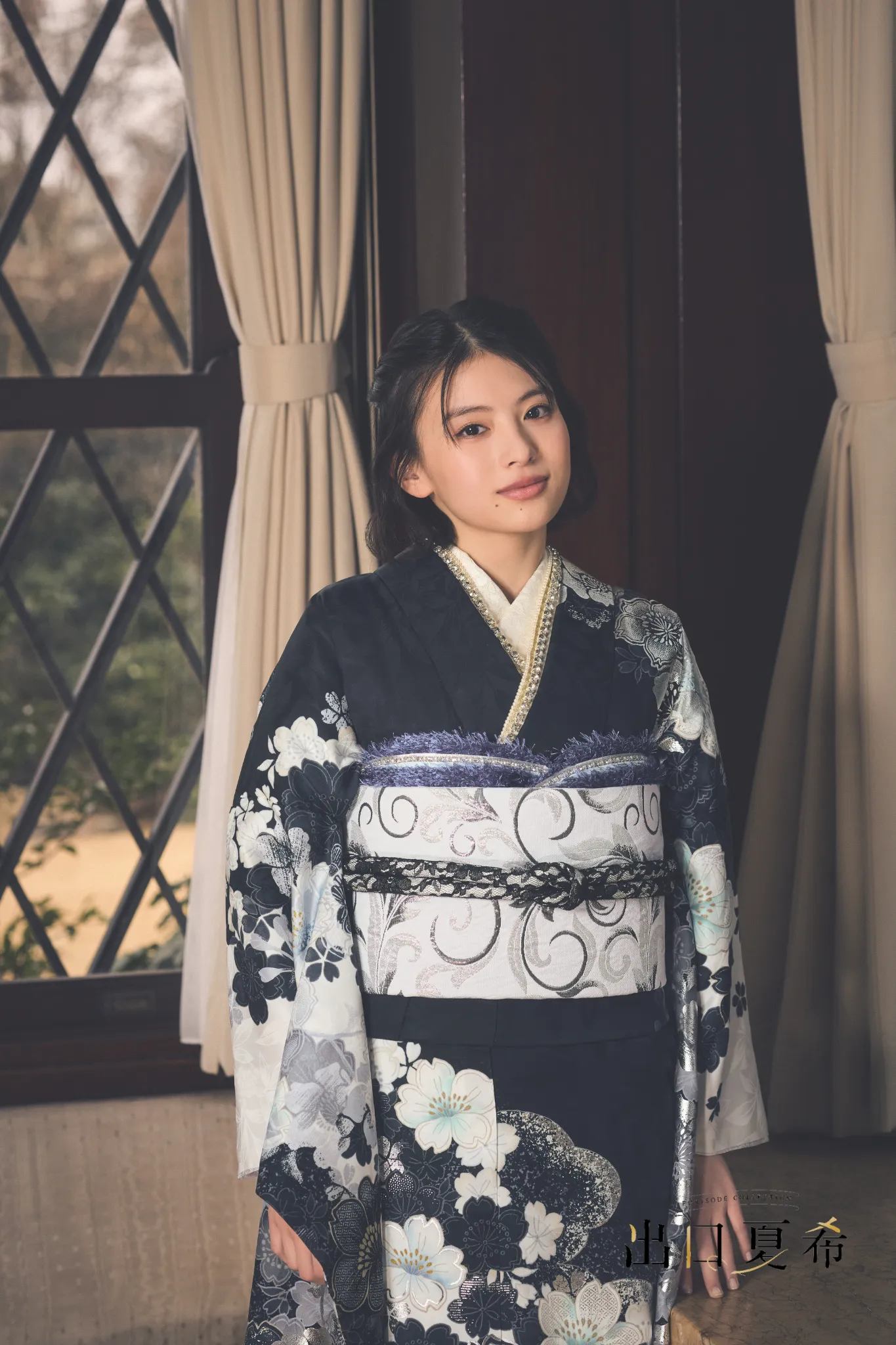 シックな黒地に、白やシルバーの花々が上品に咲き誇るエレガントな振袖。桜や菊などの古典柄を、モノトーンでまとめることで洗練された大人の雰囲気を演出しています。胸元にはラメやラインストーンが施された重ね衿があしらわれ、さりげない華やかさとトレンド感もプラスされています。 着用モデルは、透明感と落ち着いた魅力で人気の**出口夏希さん**。控えめで上品ながらも、自分らしさをしっかり表現できる一着です。