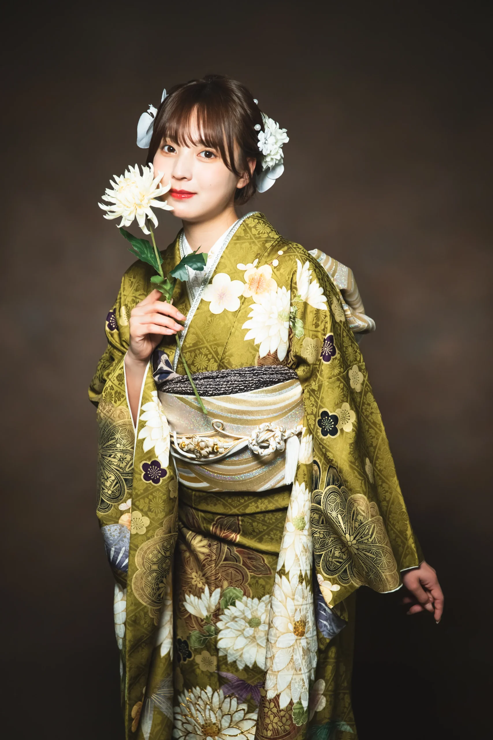 深みのあるオリーブグリーンに白菊が映える、上品で華やかな振袖。 シックな色味の中に、金彩や紫の差し色が美しく調和し、気品あふれる印象に。 格式のある古典柄ながら、モダンな帯合わせでトレンド感もプラス。 大人っぽく品よく仕上げたいお嬢様におすすめの一着です。 成人式や前撮りでも優雅な存在感を放ち、写真映えも抜群。 【PLUM】では、正統派からトレンド系まで幅広い振袖コーデをご提案しています。
