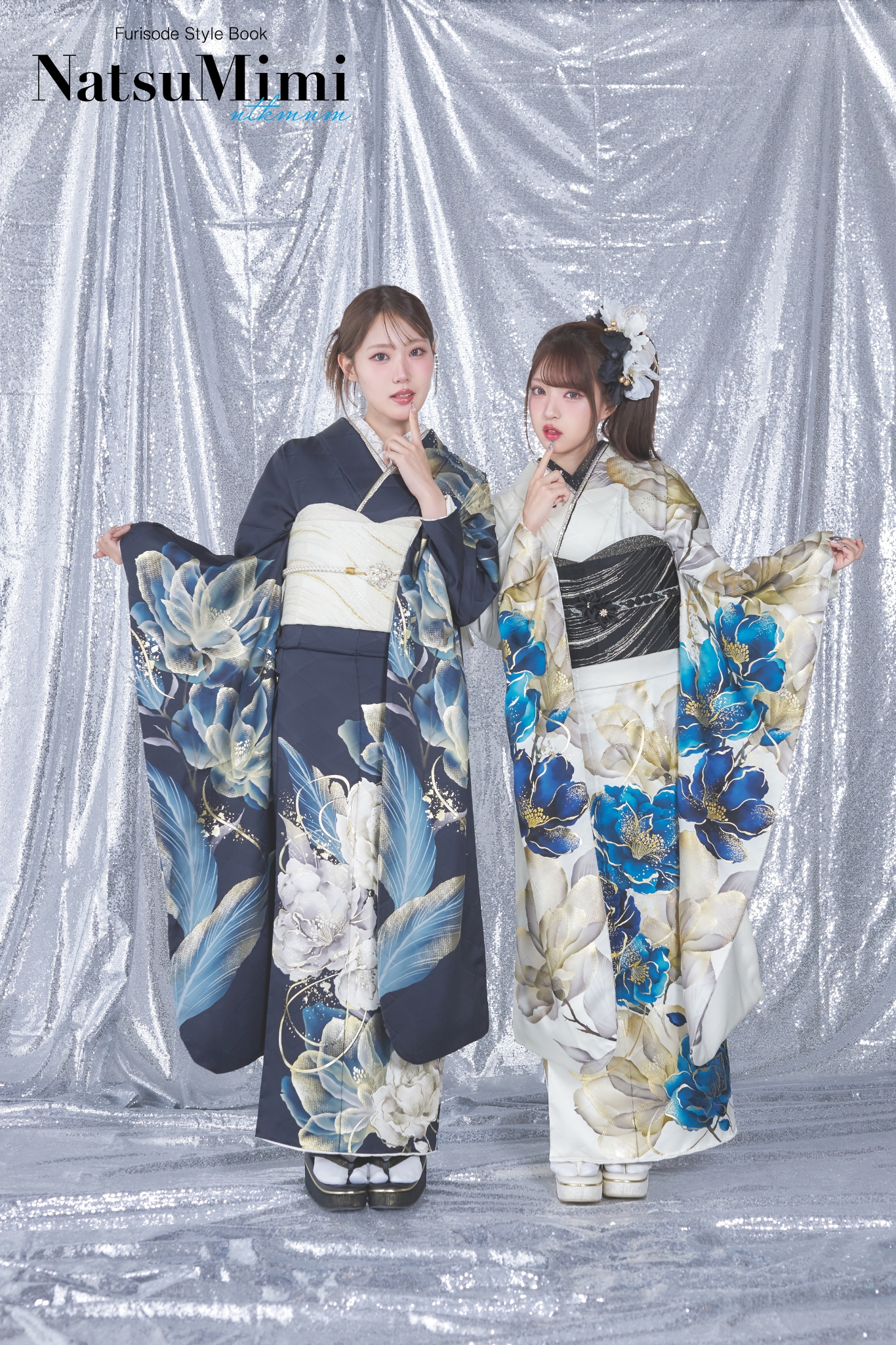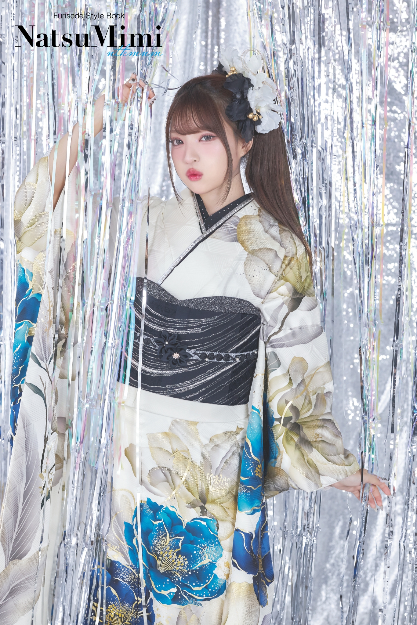 インフルエンサー・ナツキ&ミナミが手がけるブランド【NatsuMimi】の最新作。 白地にブルーの大輪花が咲き誇る、都会的で透明感あふれる一着。 クールさと華やかさを両立した主役級の振袖です。岐阜でNatsuMimi振袖を探すならPLUMへ。