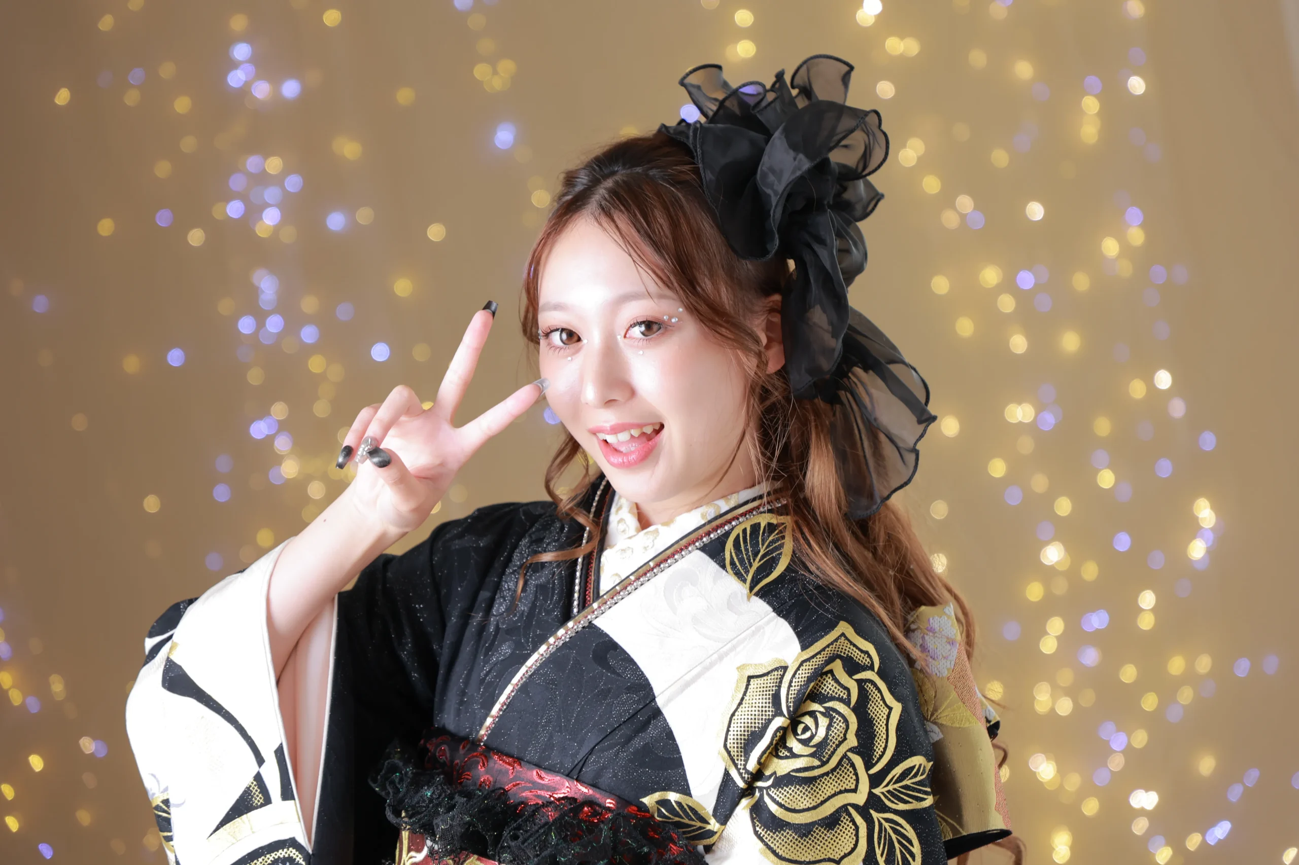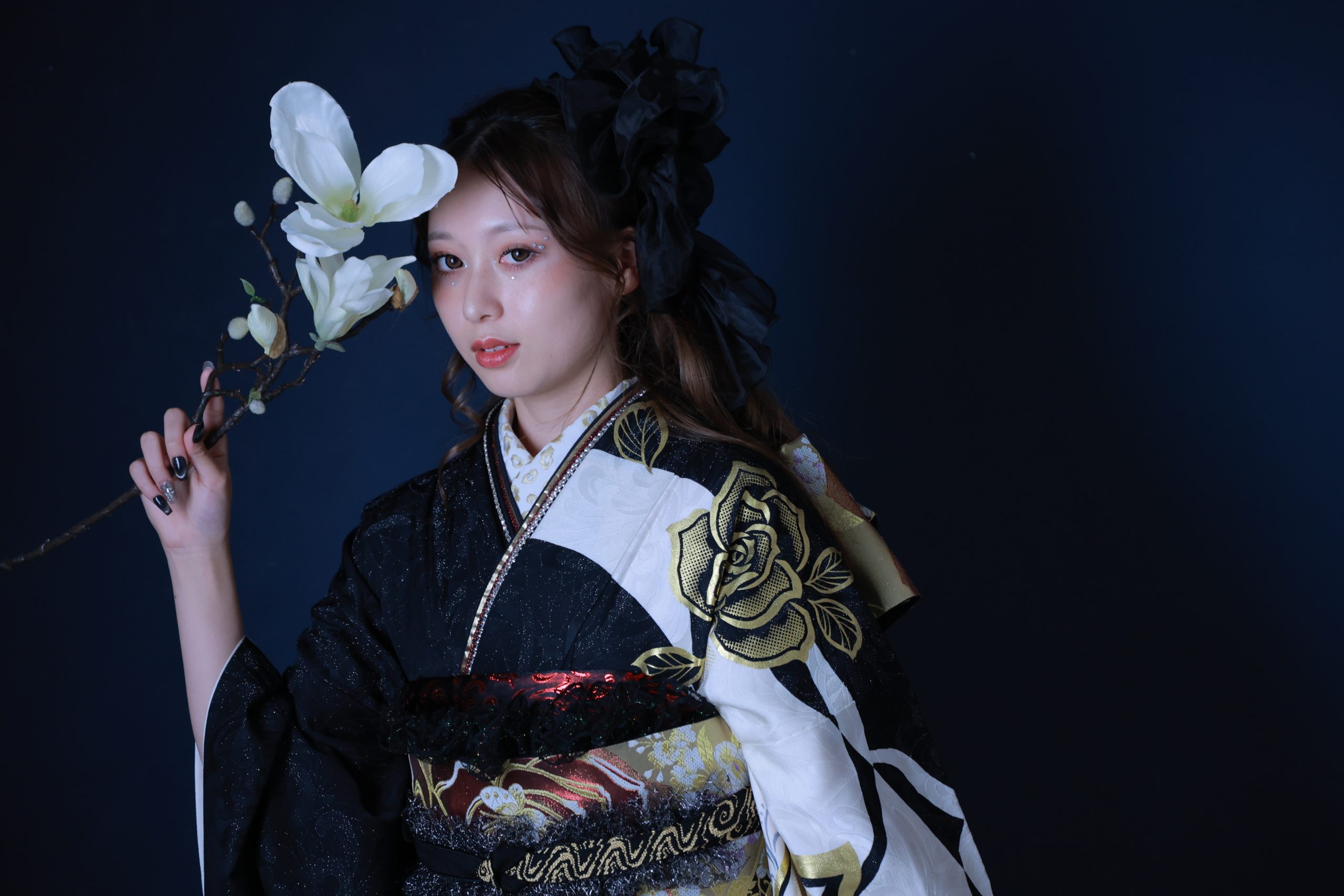 白と黒のコントラストが際立つ〈モード系黒振袖〉。 ゴールドの差し色が華やかさと高級感を引き立て、成人式会場でもひときわ目を惹く一枚です。 大胆なバラ柄が印象的で、スタイリッシュながらも女性らしい気品を感じるデザイン。 黒振袖をクールに着こなしたい方や、個性を大切にしたいお嬢様におすすめ。 PLUMでは、モード・古典・ガーリーなど幅広いテイストの〈振袖レンタル〉を岐阜・大垣・一宮エリアで展開中。 成人式の前撮りや当日コーディネートもプロがトータルサポートいたします。