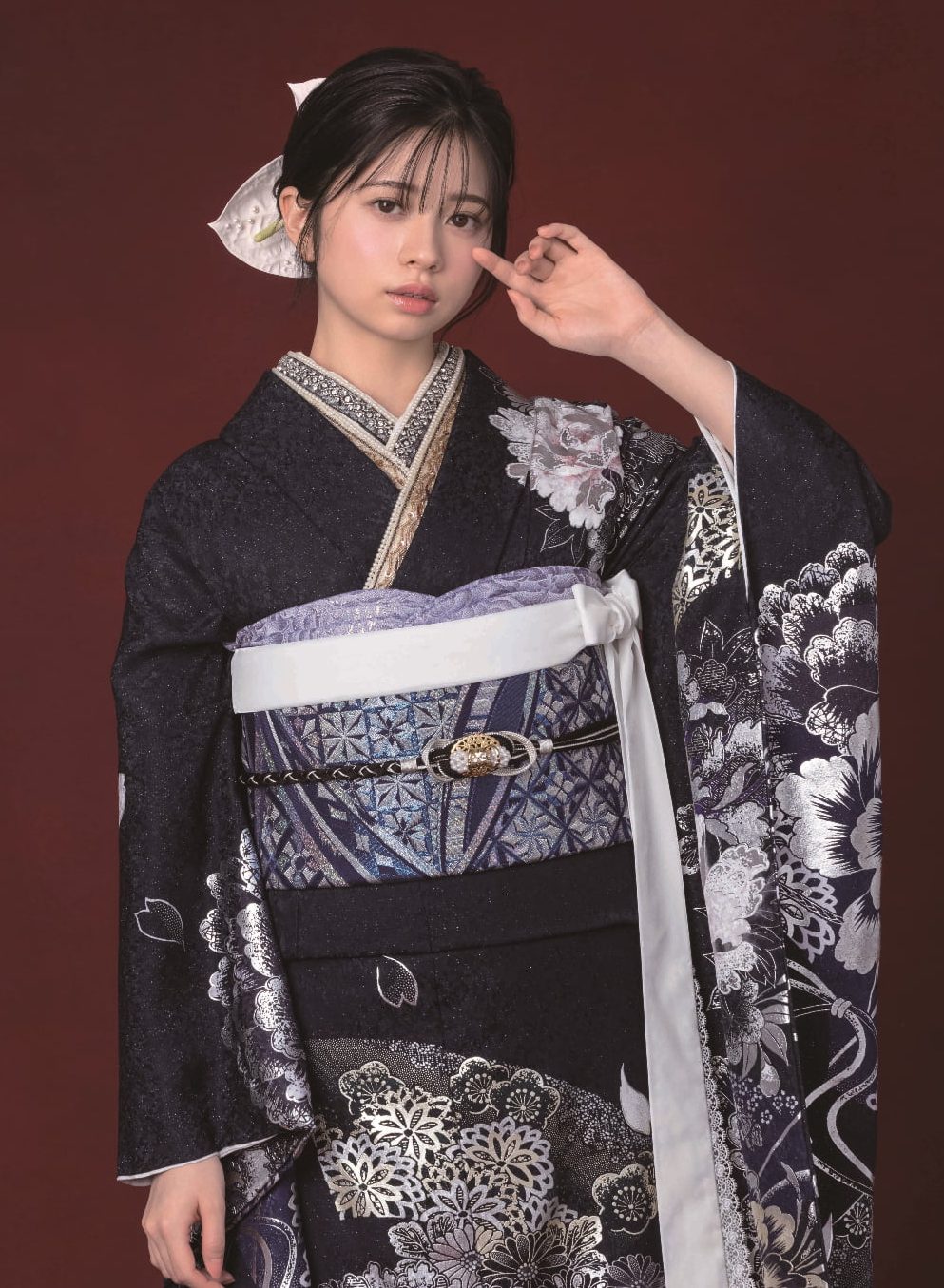 【女優・桜田ひより 着用】 深みのあるネイビー地に、白牡丹が咲く気品あふれる振袖。 金彩とシルバーの刺繍が光を受けてきらめき、洗練された大人の美しさを演出します。 桜田ひよりさんの凛とした雰囲気を引き立てるクラシカルモードな一枚。 岐阜でネイビー振袖・金彩振袖・上品振袖を探すなら【PLUM】へ。 格式高く、永く愛される美しさをあなたに。
