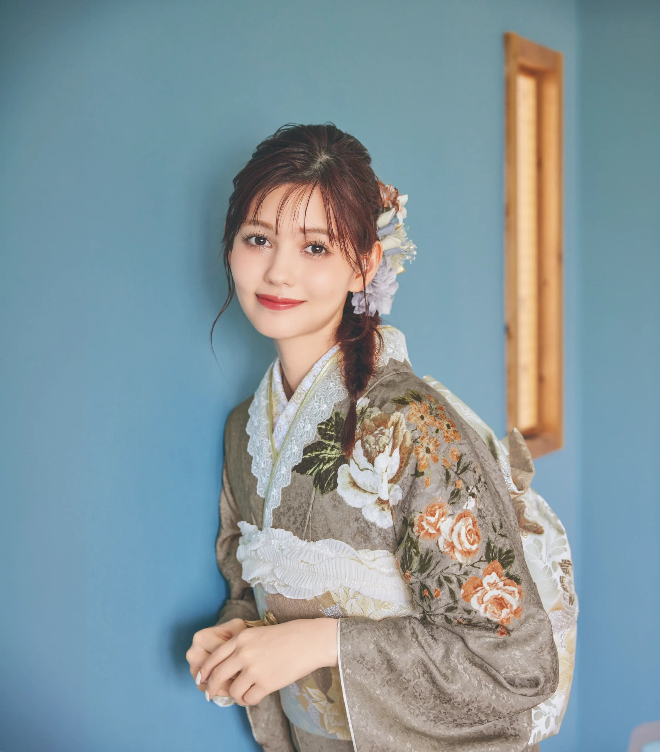 落ち着いたベージュブラウンに、オレンジとホワイトの大輪花が華やかに咲くクラシカルな振袖。 深みのある色調が上品さを引き立て、しっとりとした大人の魅力を演出します。 繊細な花柄が映えるデザインで、写真にも美しく残る一着です。 岐阜・愛知でクラシック系振袖・落ち着いたトーンの振袖を探すなら【PLUM】へ。 店頭でぜひ実物の美しさをご体感ください。
