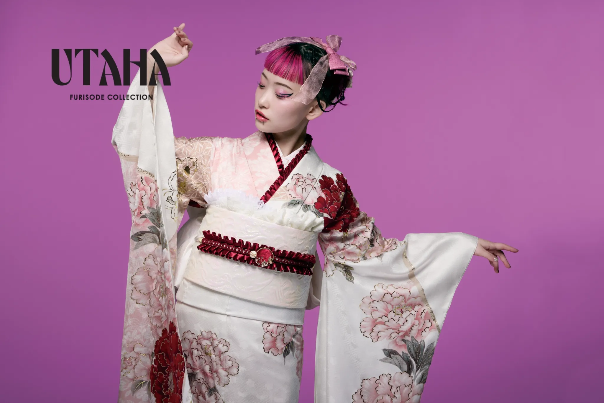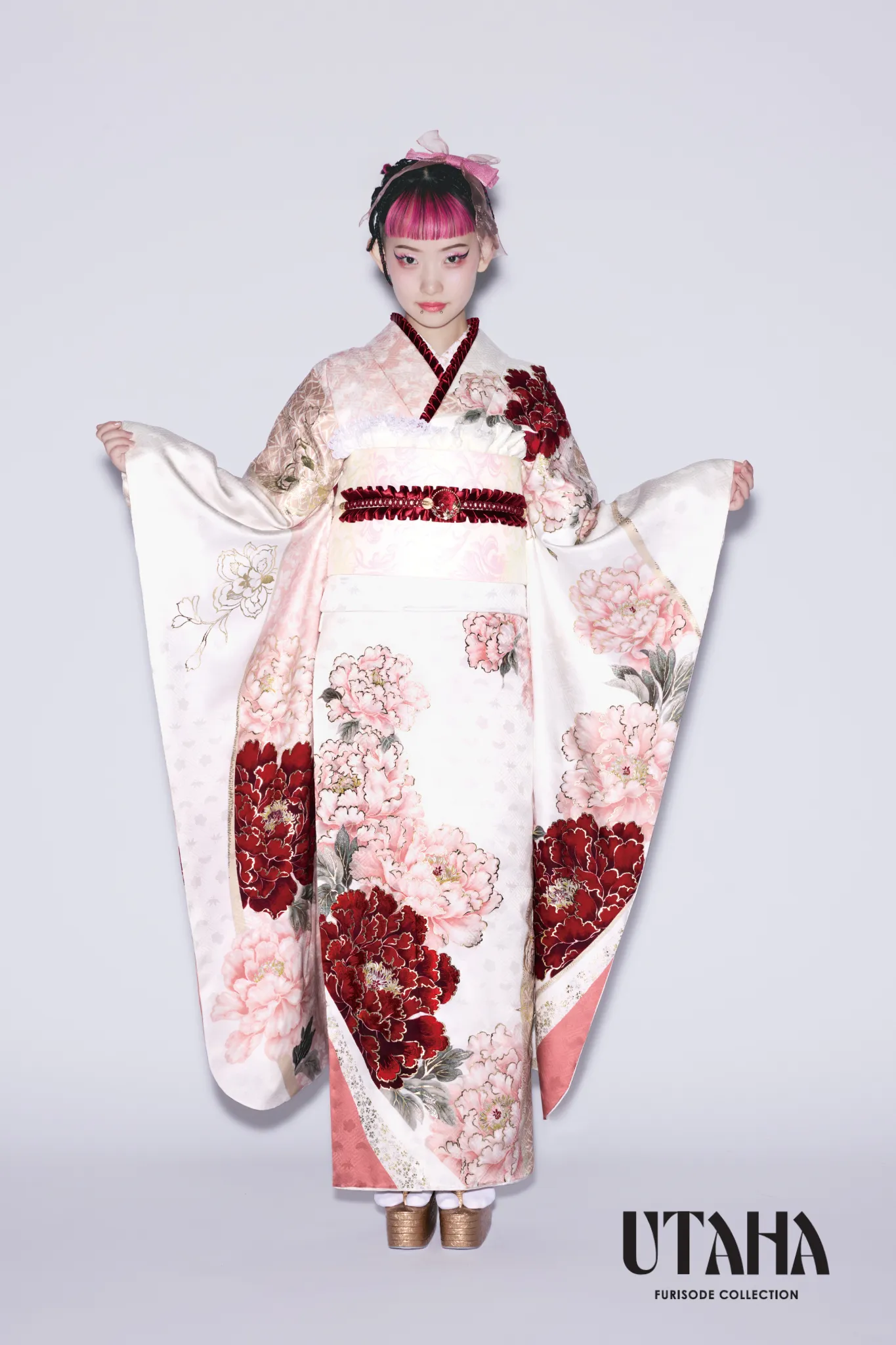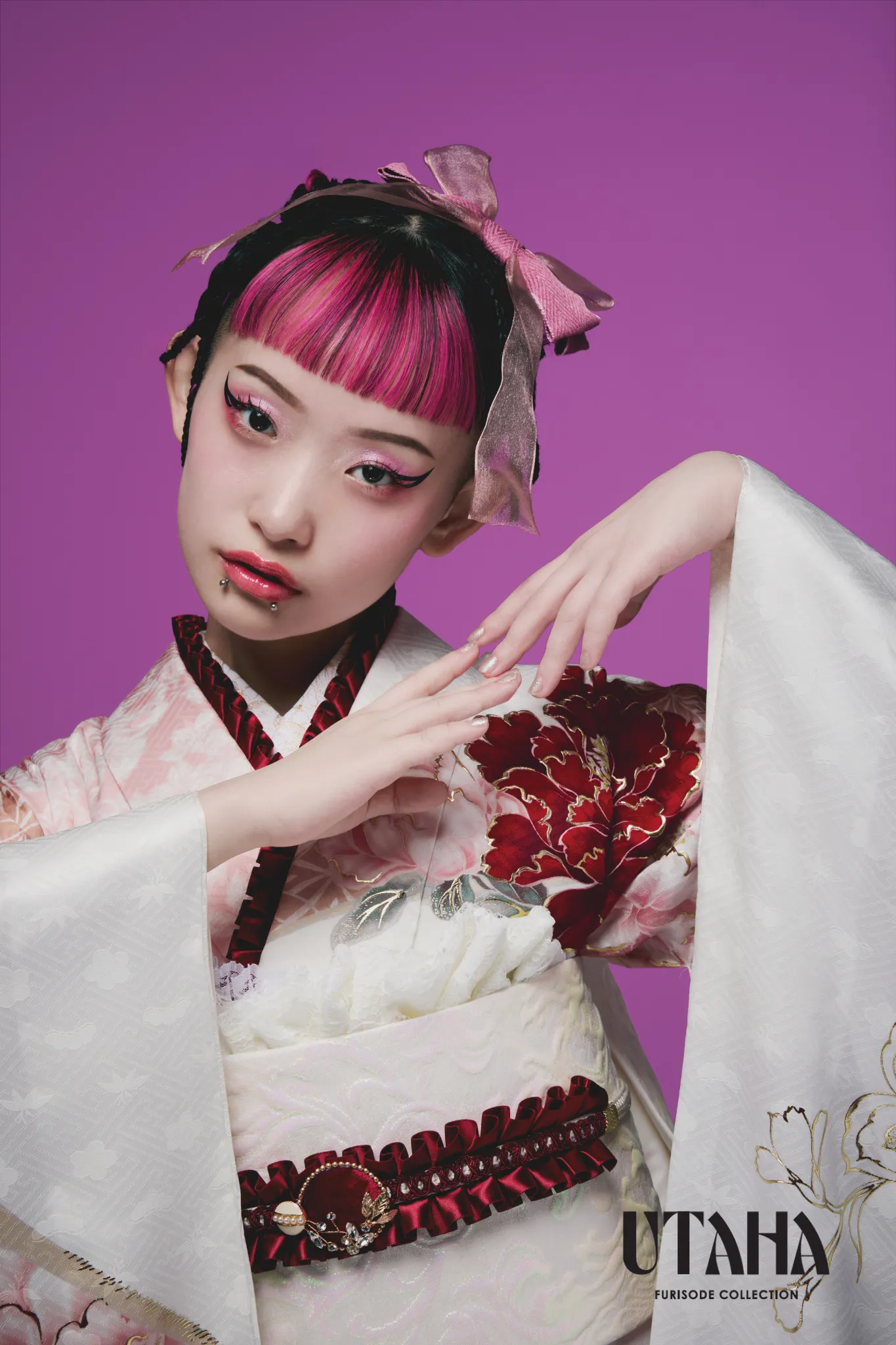 やわらかなオフホワイト地に、淡いピンクから深紅のグラデーションで描かれた大輪の牡丹が咲き誇る、ロマンティックで存在感ある振袖。全体のトーンは優しくも、赤のインパクトが効いており、甘さと強さが絶妙に共存しています。 帯まわりにはフリルやレースがあしらわれ、まさに「自分だけの世界観」を纏えるデザインです。 着用モデルは、水曜日のカンパネラのボーカル・**詩羽さん**。独自のスタイルと世界観をもつ彼女にぴったりの、個性を大切にしたい人へ贈る一着です。