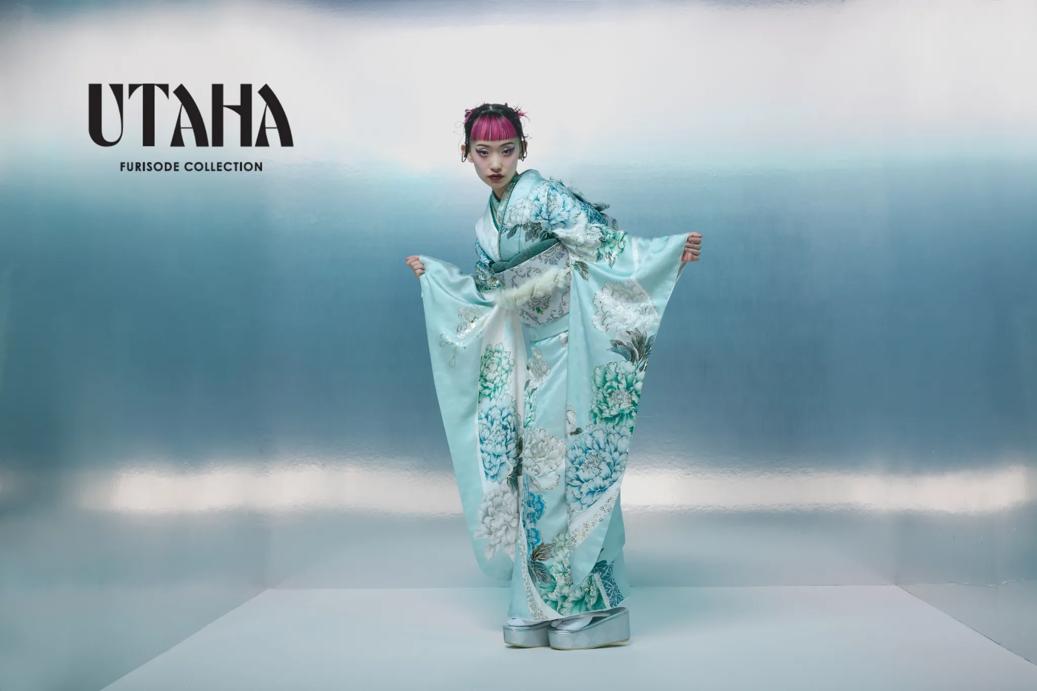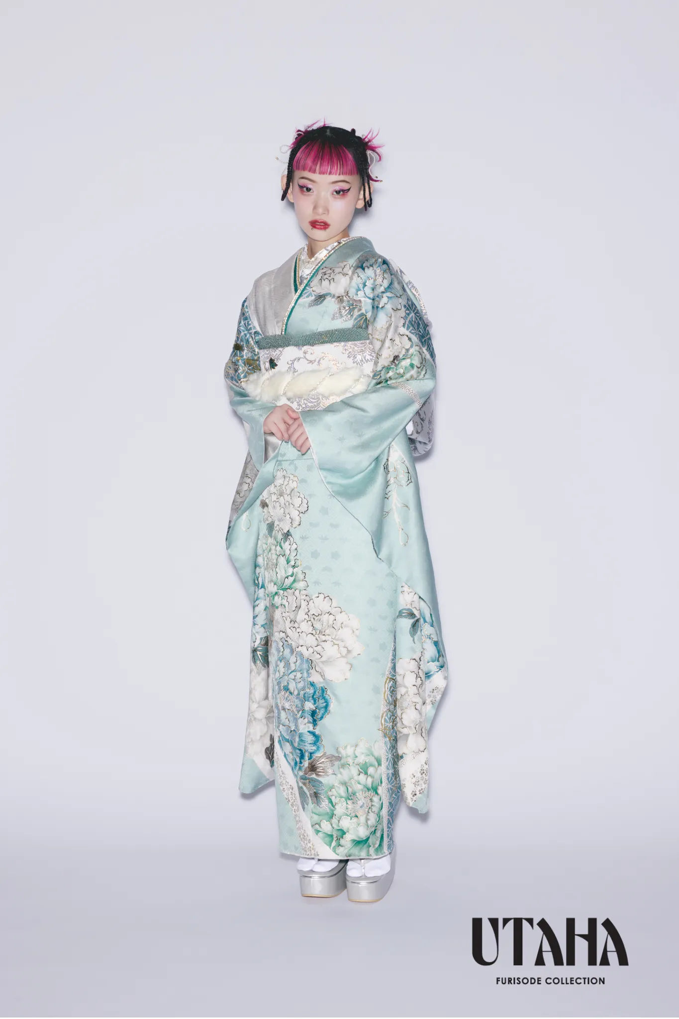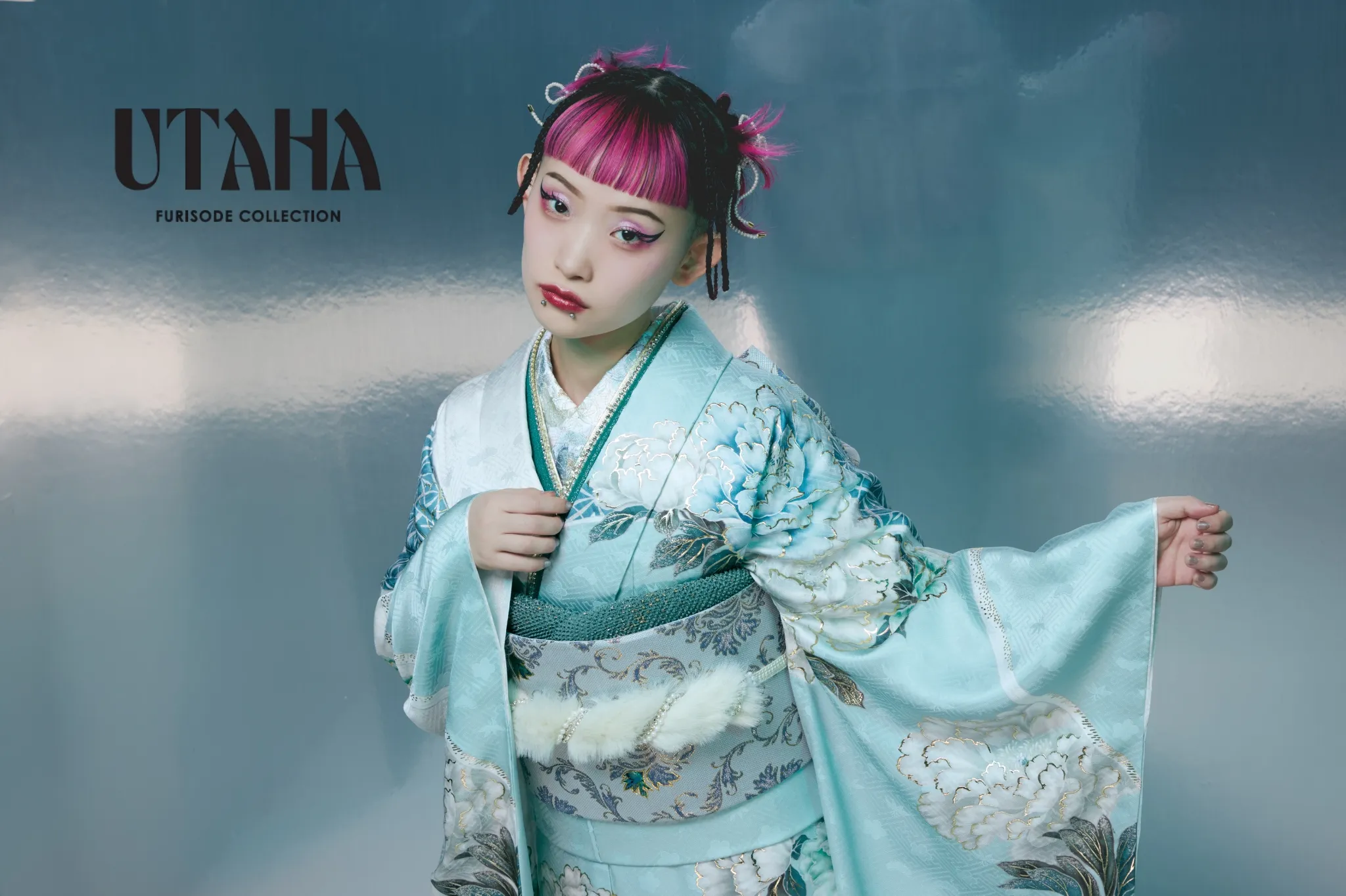 淡いミントグリーンが爽やかに広がる、透明感あふれる振袖。 清楚な中にも華やかさを感じさせる白牡丹や青みがかった花々が描かれ、動くたびに柔らかな光を反射する上品な地紋が高級感をプラスします。帯にはシルバーとミントのバランスが絶妙なモダンデザインを採用し、全体のトーンに統一感を。可愛らしさよりも“洗練された美しさ”を重視したい方にぴったりの一着です。 着用モデルは、水曜日のカンパネラの**詩羽さん**。クールで芯のある美しさが、この振袖の透明感とベストマッチ。周りと差がつく、スタイリッシュな成人式スタイルに。