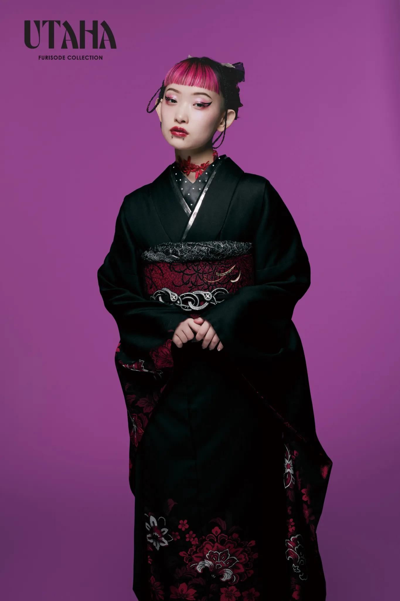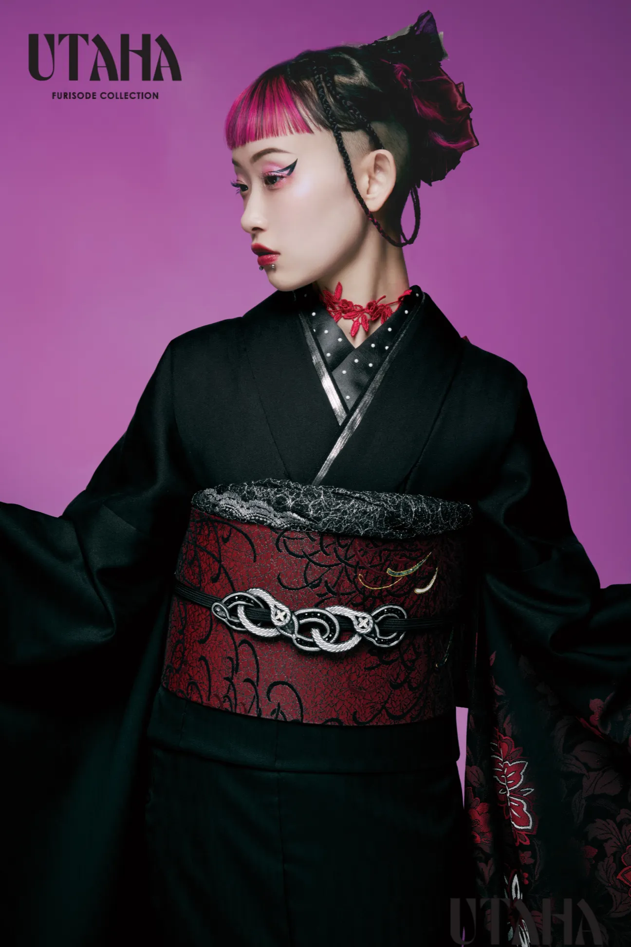漆黒の地に、深紅の花々が浮かび上がるように咲く、圧倒的な存在感を放つ振袖。 黒×赤の王道配色に、レースやチェーン、スタッズといったロックテイストなディテールが加わり、まさに“和×モード”を体現する1着に仕上がっています。帯には重厚感ある赤のレース地を採用し、個性を際立たせるアクセントに。甘さを抑えたシャープな美しさが魅力です。 着用モデルは、水曜日のカンパネラの**詩羽さん**。唯一無二の世界観で魅せる、妥協しない自分らしさを大切にしたい人にぴったりの振袖です。