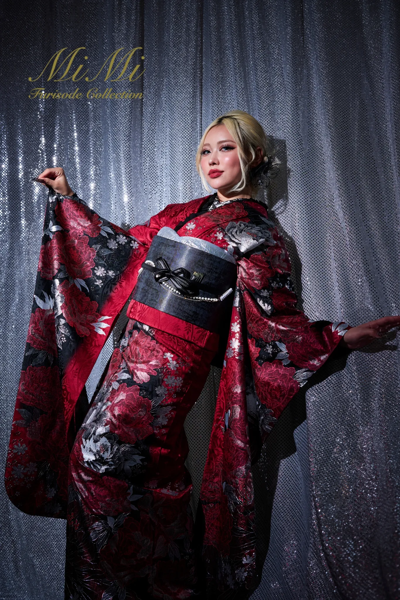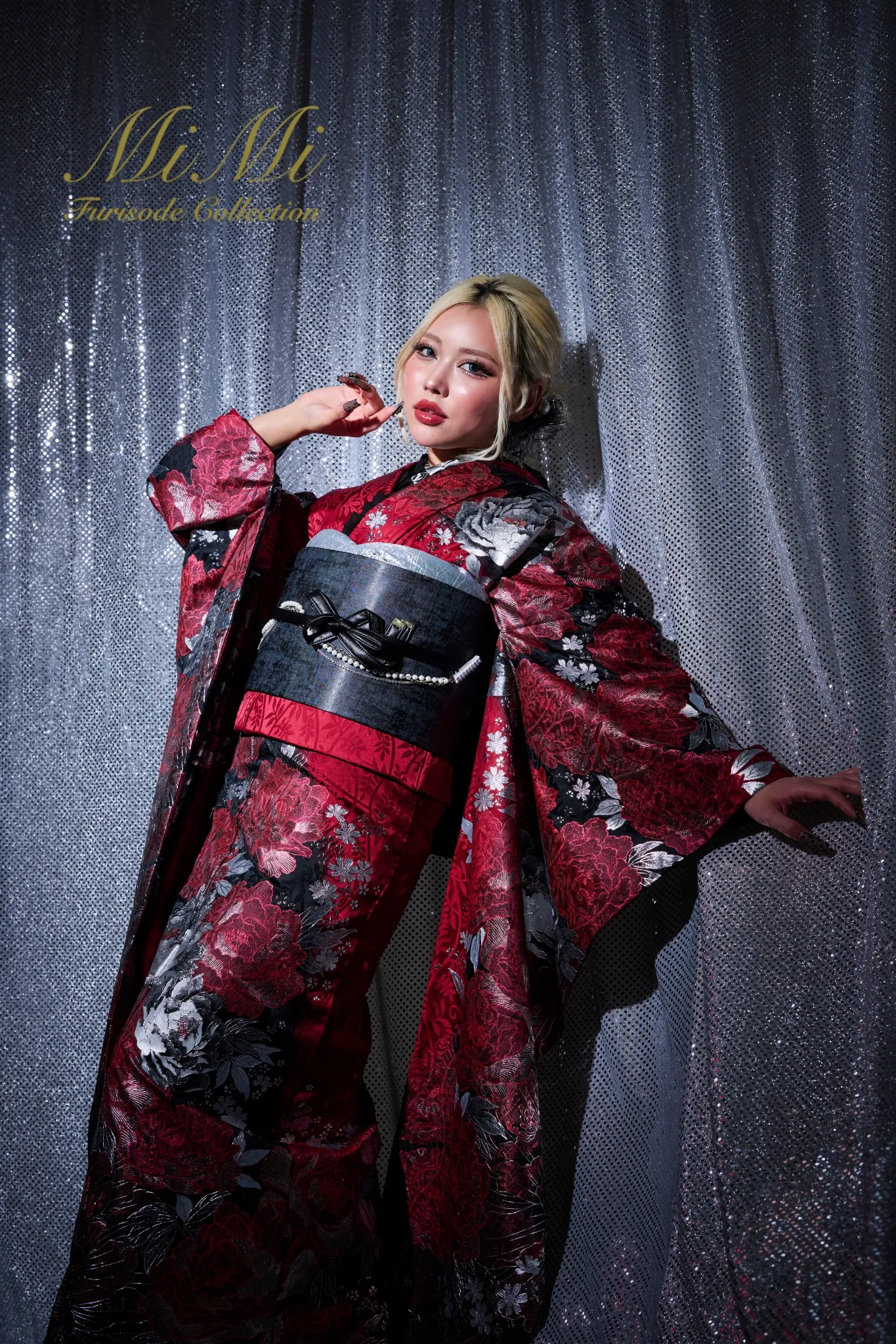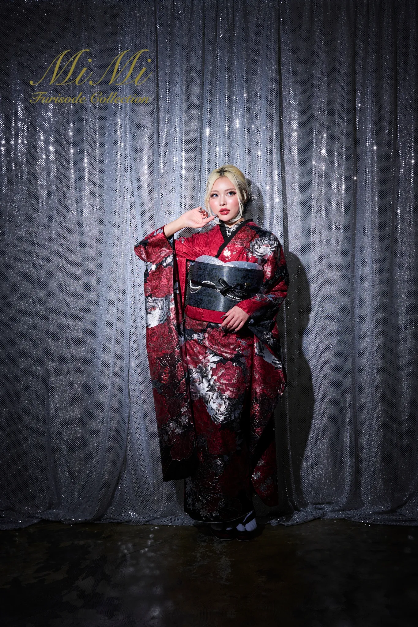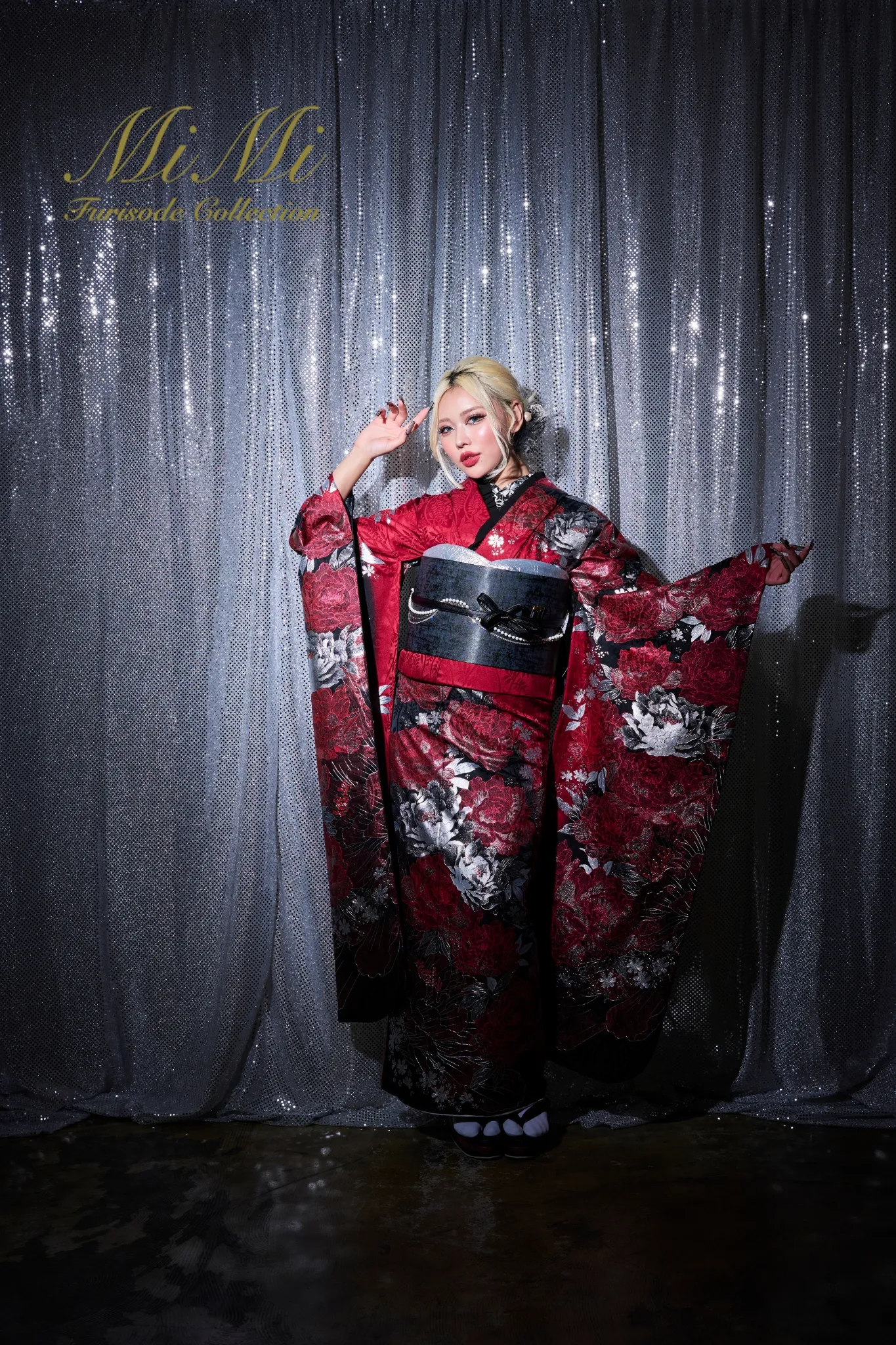 深紅×黒のコントラストが美しい振袖。大輪の牡丹が咲き誇る艶やかなデザインで、モード感と女性らしさを兼ね備えたクール系振袖です。光沢感のある生地と黒の帯が高級感を引き立て、成人式や前撮り撮影でも圧倒的な存在感を放ちます。こちらは元eggモデル・きぃぃりぷさん着用振袖としても注目を集める人気デザイン。かっこいい中にも華やかさを感じる、大人ギャルスタイルにぴったり。岐阜で振袖を探すなら【PLUM】へ。人と被らない、最強の主役コーデを
