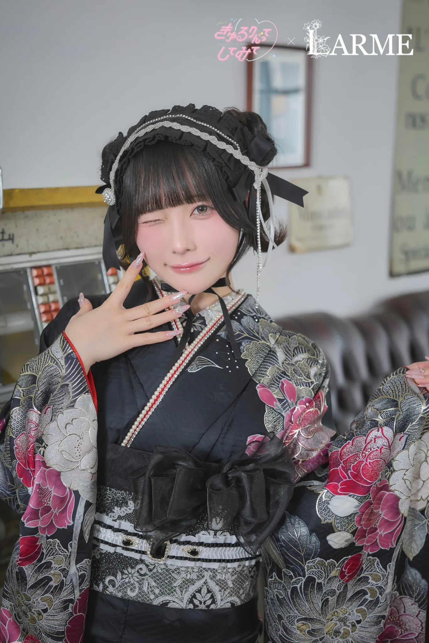 アイドルグループ きゅるりんてしてみて が着用した、 とびきり“きゅる”でロマンティックな一着。 凛とした黒地に、華やかな振袖は、 可愛さの中に上品さを感じさせる王道ガーリー×ゴシックスタイル。 白シルバーのレース小物やリボンディテールを合わせることで、 まるで物語のヒロインのような世界観を演出します。 「甘めが好き」「とことん可愛く成人式を迎えたい」 そんな想いを叶えてくれる、LARMEテイスト満載の振袖です。