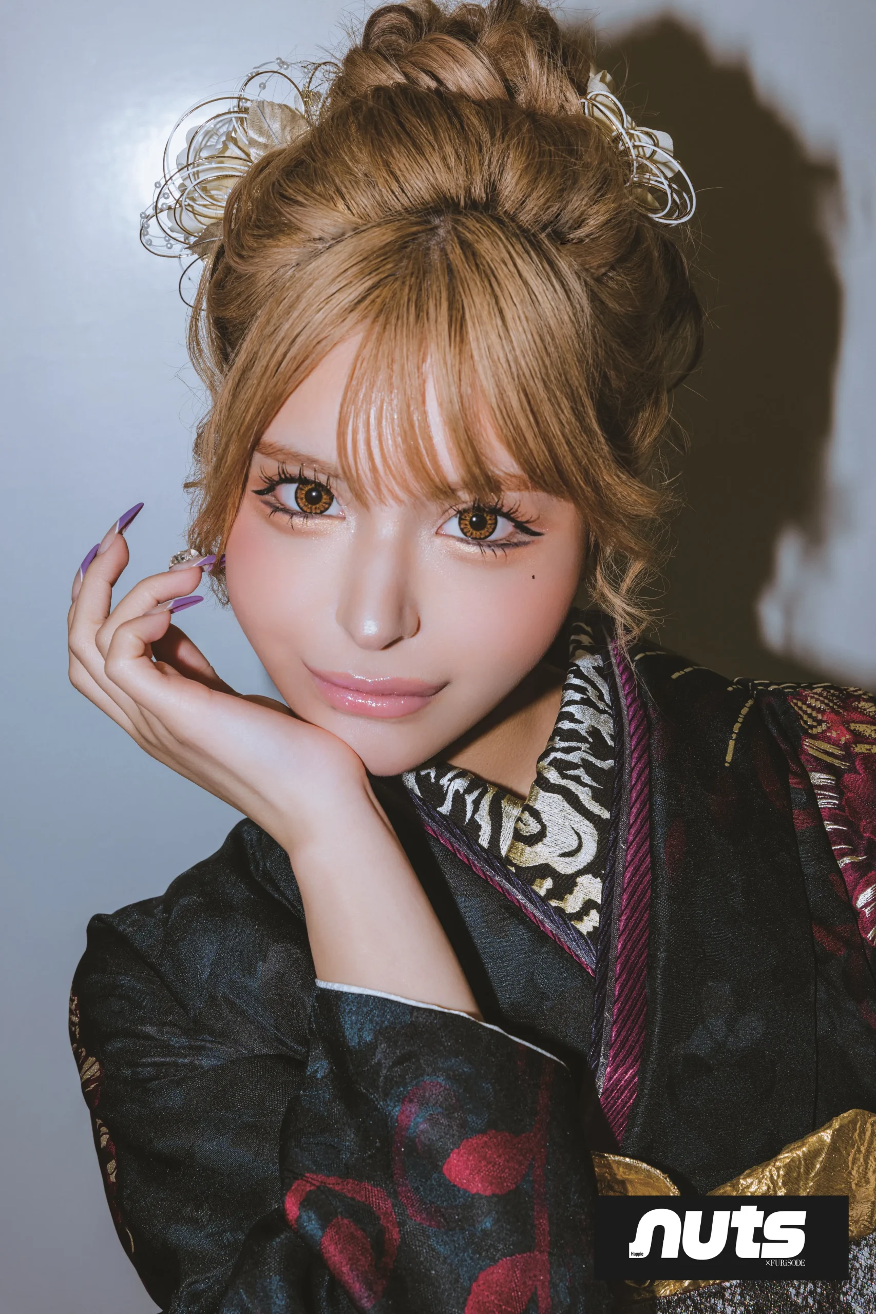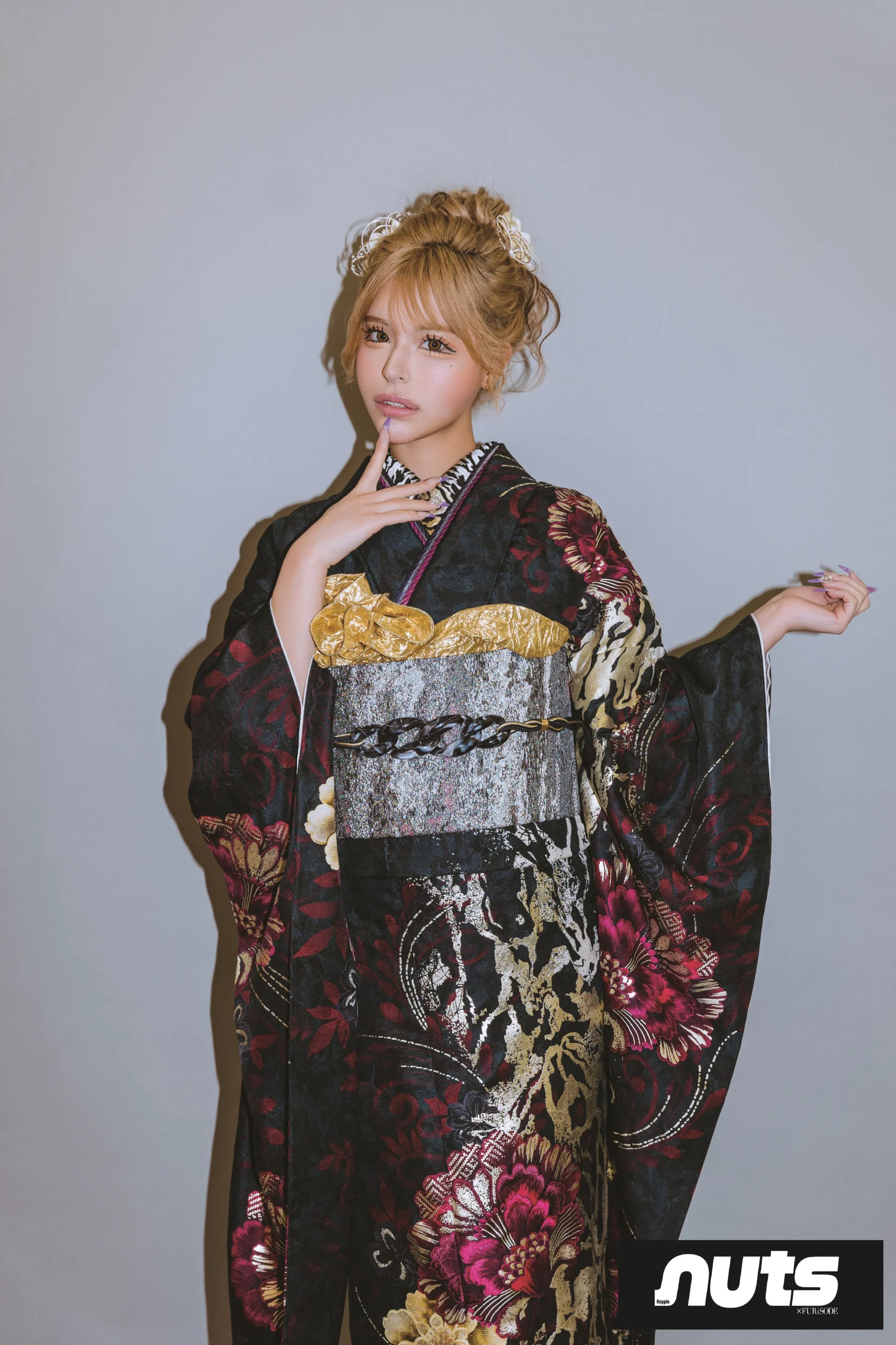 シックな黒地に深紅や金の牡丹が咲き誇る、圧巻の存在感を放つ振袖。ラメや箔の光沢が絶妙に効いていて、写真映えもばっちり◎ クールでかっこいい印象の中に、花柄の華やかさと女性らしさをしっかり感じさせるデザインです。ゴールドとシルバーの帯で豪華さをプラスしながら、モードな雰囲気も演出。雑誌NUTSとの特別コラボで、ギャルっぽさと品の良さを両立させた1枚。着用モデルはAngeちゃん♡「他の子と被りたくない!」そんなあなたにおすすめ!