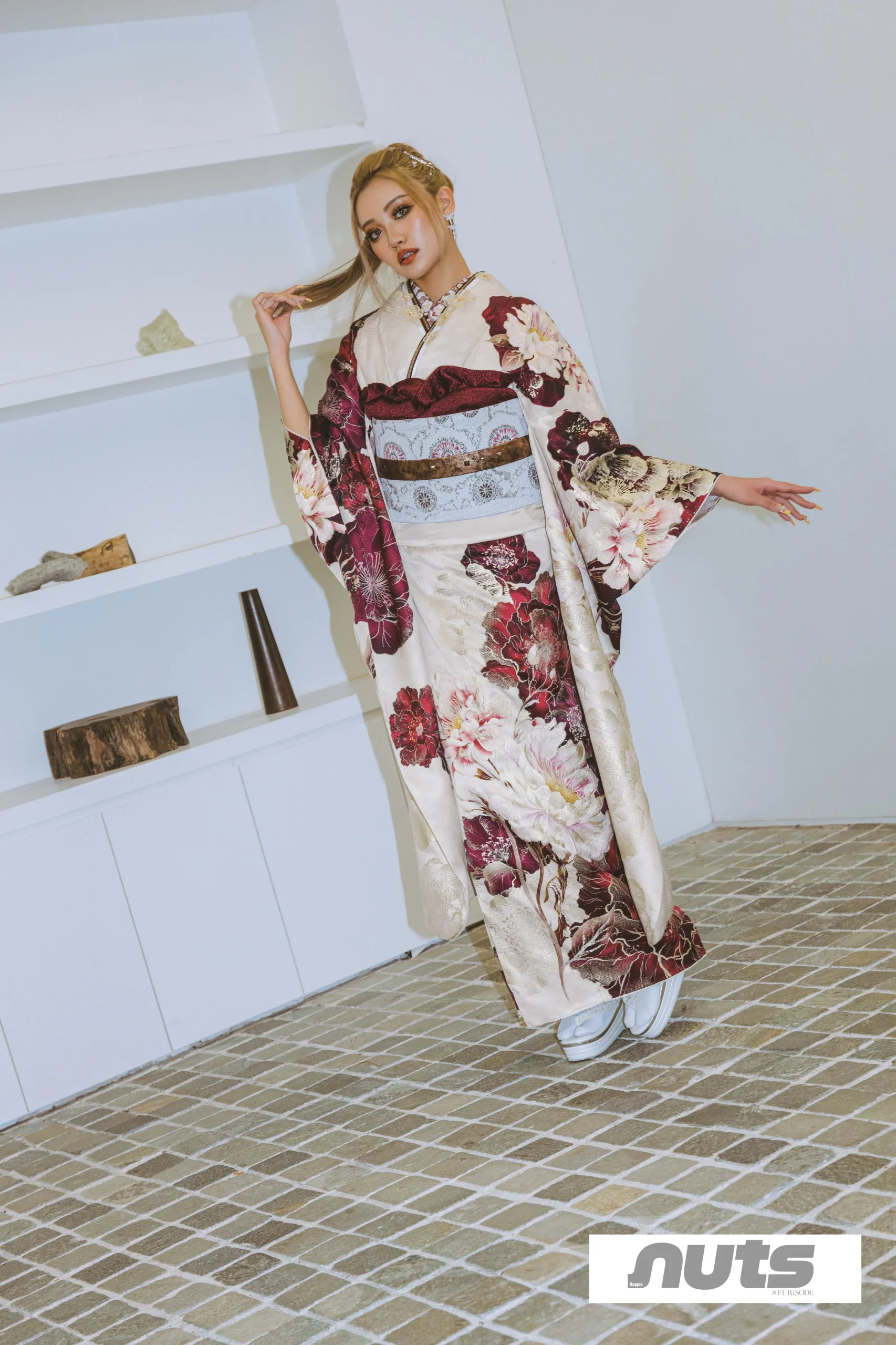 気品あふれるアイボリーベースに、大胆な赤と白の牡丹柄が華やかに咲き誇る振袖。くすみ系カラーとゴールドの絶妙なバランスで、大人っぽさと可愛さの“いいとこどり”が叶う一着です。上品なグレーブルーの帯で抜け感をプラスしつつ、ワインレッドの差し色が全体をキュッと引き締めてくれるのもポイント♡ナチュラルだけど印象に残る、そんなスタイルを目指す20歳のあなたへ。雑誌nutsとの最強コラボ、着用モデルはRionちゃん!写真映えも間違いなし◎