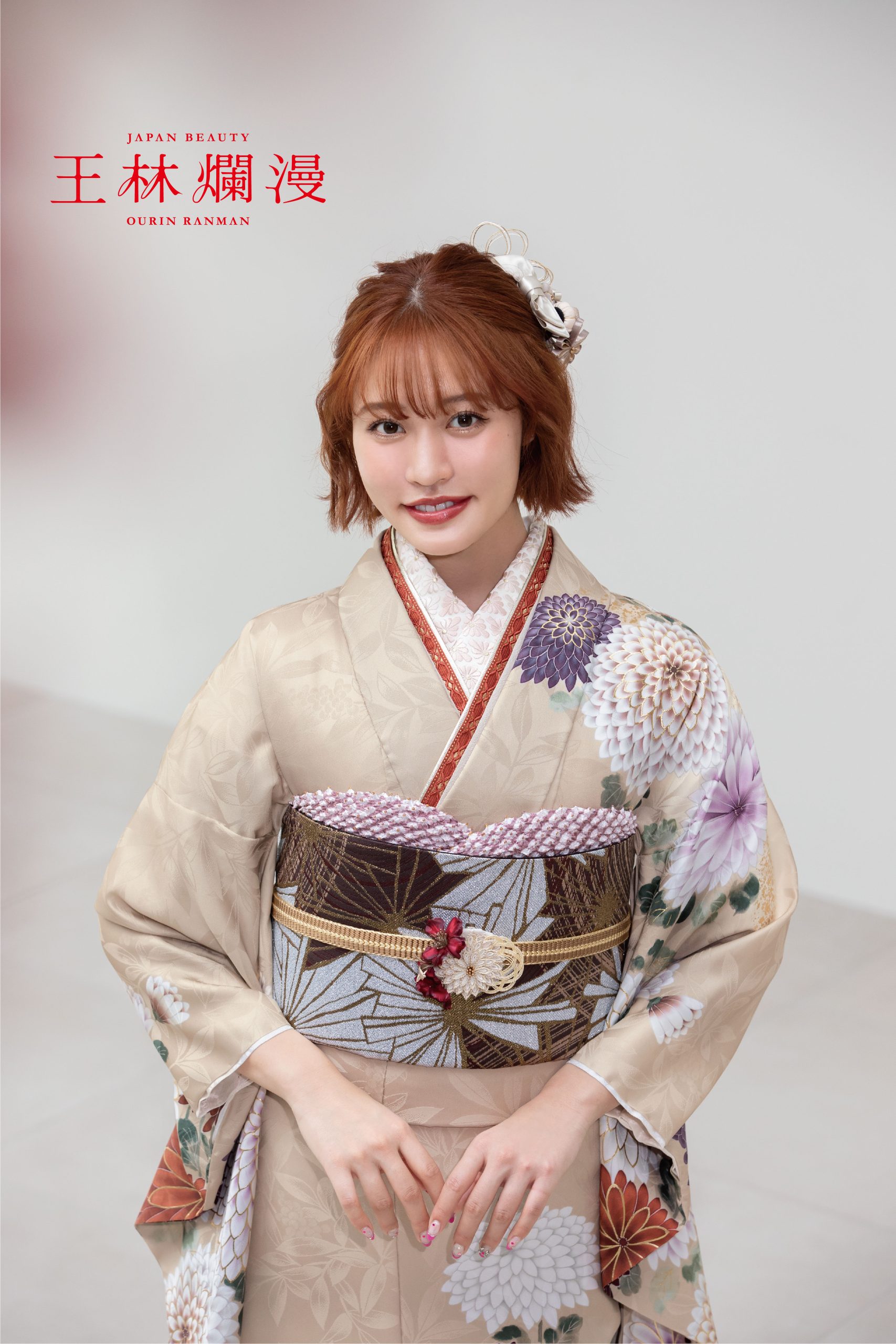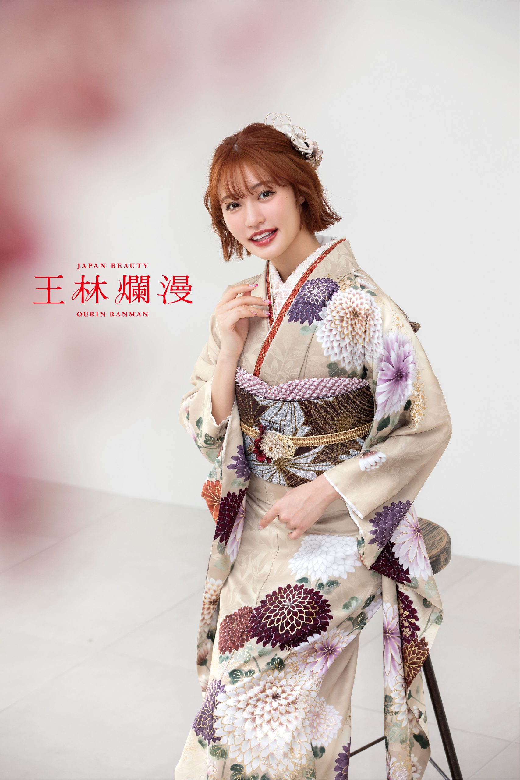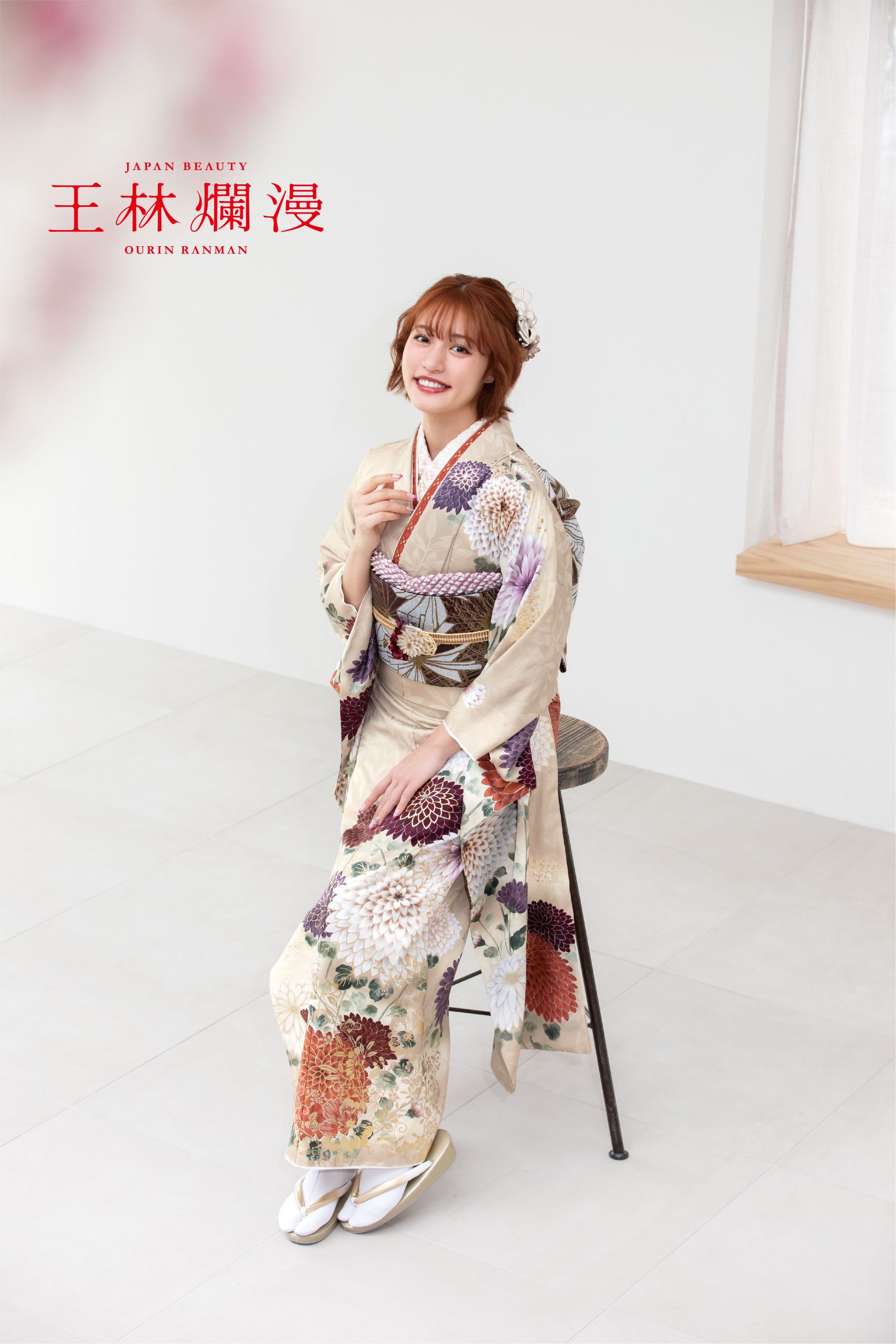 大人気王林ちゃん着用の振袖。 ベージュにかわいらしいお色みの菊が華やか。 地紋の大きな花柄で光沢がでて素敵。 見え方によってくすみピンクにもみえるので可愛い雰囲気がお好きな方にはぴったりです。アクセントでオレンジ色が入っているので小物などにもいれると統一感UPです☆