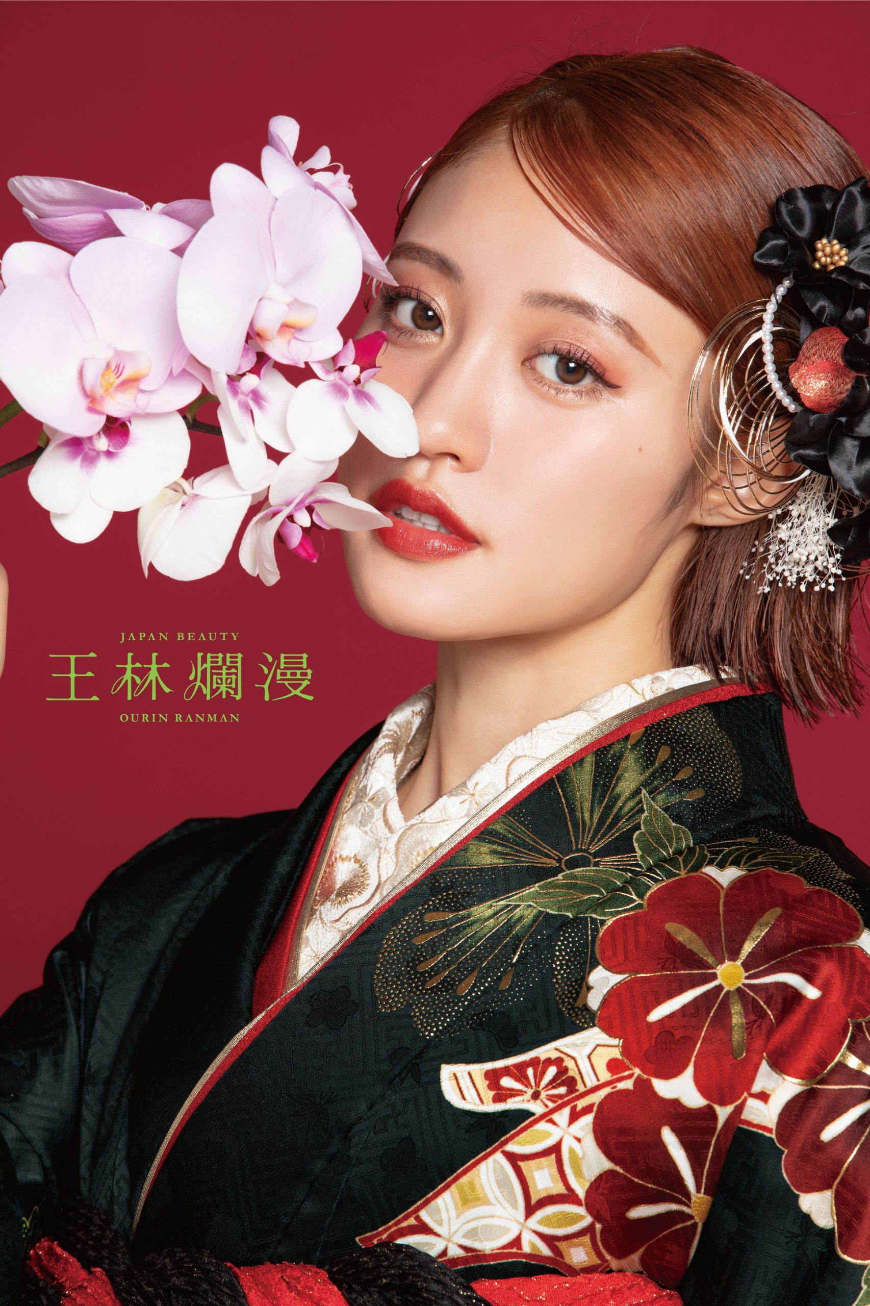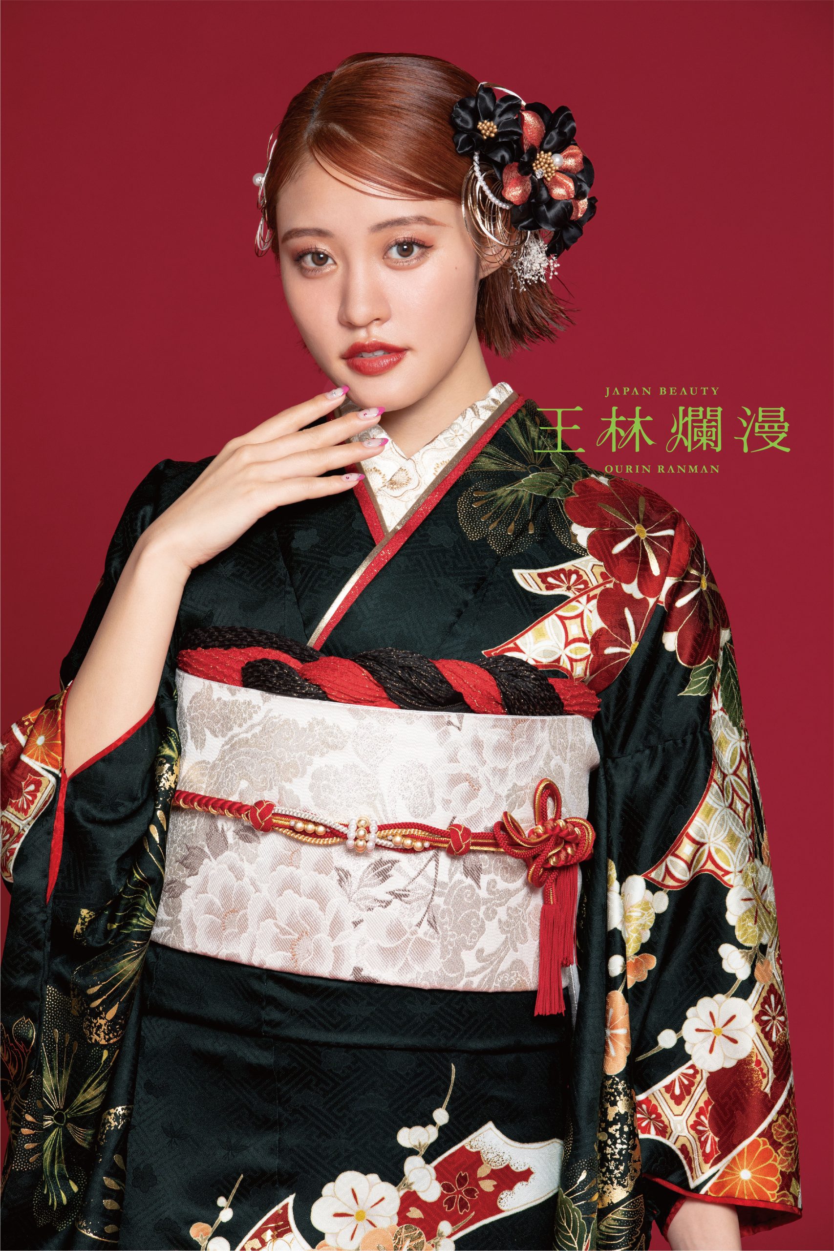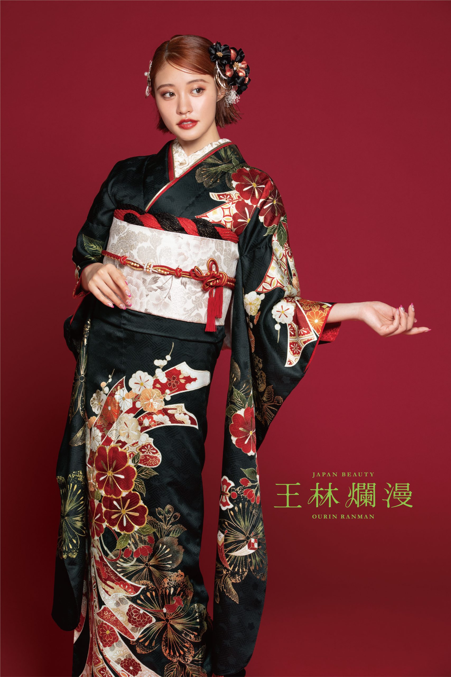 深みのある黒地に、赤・金の華やかな古典文様が際立つ王林さん着用の一着。 大胆にあしらわれた牡丹や梅の文様は、圧倒的な存在感と上品さを両立し、成人式らしい特別感を演出します。 赤の差し色を効かせた帯まわりが、より洗練された大人の雰囲気をプラスし、前撮りでも式当日でも写真映え間違いなし。 クラシックな美しさと王林さんらしい可憐さが融合した、ワンランク上の“王道×モダン”振袖。 岐阜・愛知で正統派古典・黒振袖・豪華モダンをお探しの方は、ぜひPLUMで実際にお試しください。